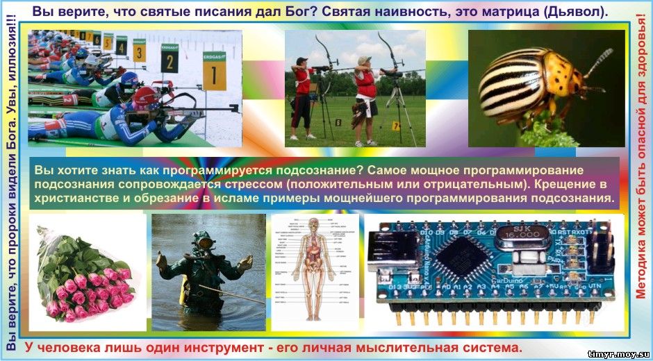 Дописка, Тимур, 05.02.2012: 01)- Цели марионеточных учений. 02)- Цель у всех учений (религиозных, эзотерических, техно), которые даются людям во сне, в состояниях транса, в откровениях, в видениях и т.п. лишь в одном. Матрица обучает людей мыслить самостоятельно. 03)- Никому и никогда Бог не давал никаких святых писаний, все это программы матрицы. Не верите? А вы проанализируйте... Только вот для того чтобы сделать такой анализ нужно иметь развитое мышление. 04)- Цель жизни человека на Земле заключается в том, чтобы он научился бы мыслить самостоятельно, независимо, гармонично, эффективно. При такой цели нет никакого смысла рассказывать людям правду об устройстве мироздания, о себе самом. Наоборот нужно смешивать истину с ложью, чтобы человек учился бы отделять зерна от плевел. Любая религия, любая эзотерика, любая наука техно созданы именно как смесь зерен и плевел.